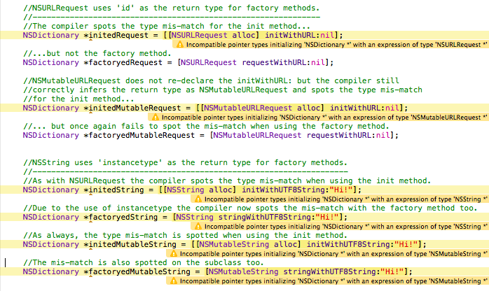 Here’s 2 examples that illustrate the improved type safety provided by instancetype. The first example uses NSURLRequest which does not use instancetype for factory methods and the second example is NSString which does:
